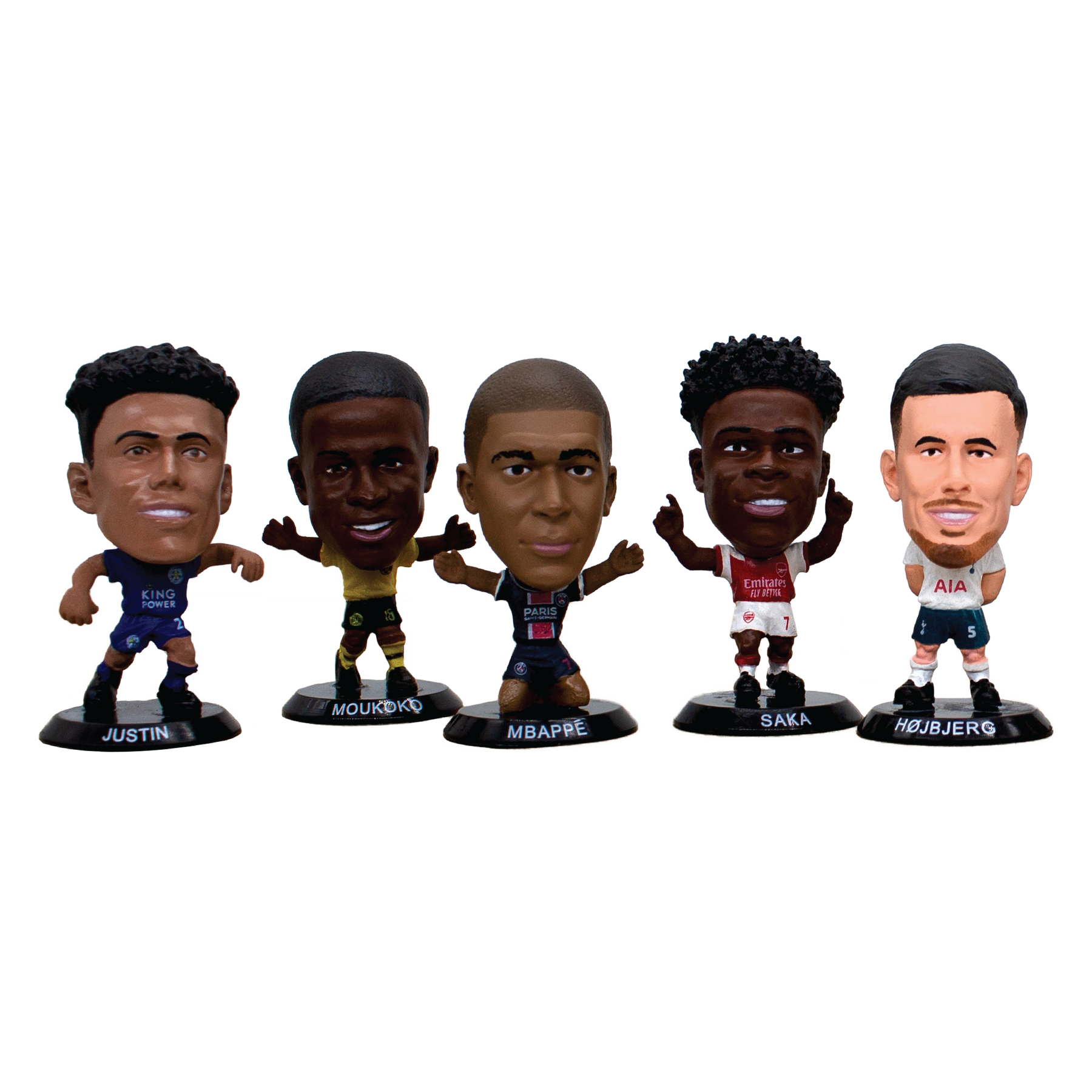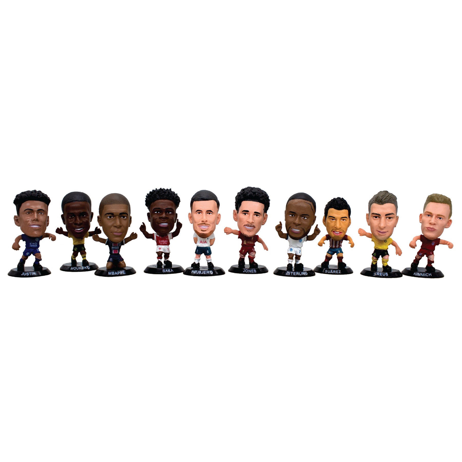 This 10-figure bundle includes Bukayo Saka, Curtis Jones, James Justin, Joshua Kimmich, Kylian Mbappé, Luis Suarez, Marco Reus, Pierre-Emille Højbjerg, Raheem Sterling (Away Kit), and Youssoufa Moukoko, all mounted on black bases, exclusive to the 2022 SoccerStarz Blind Bag range.