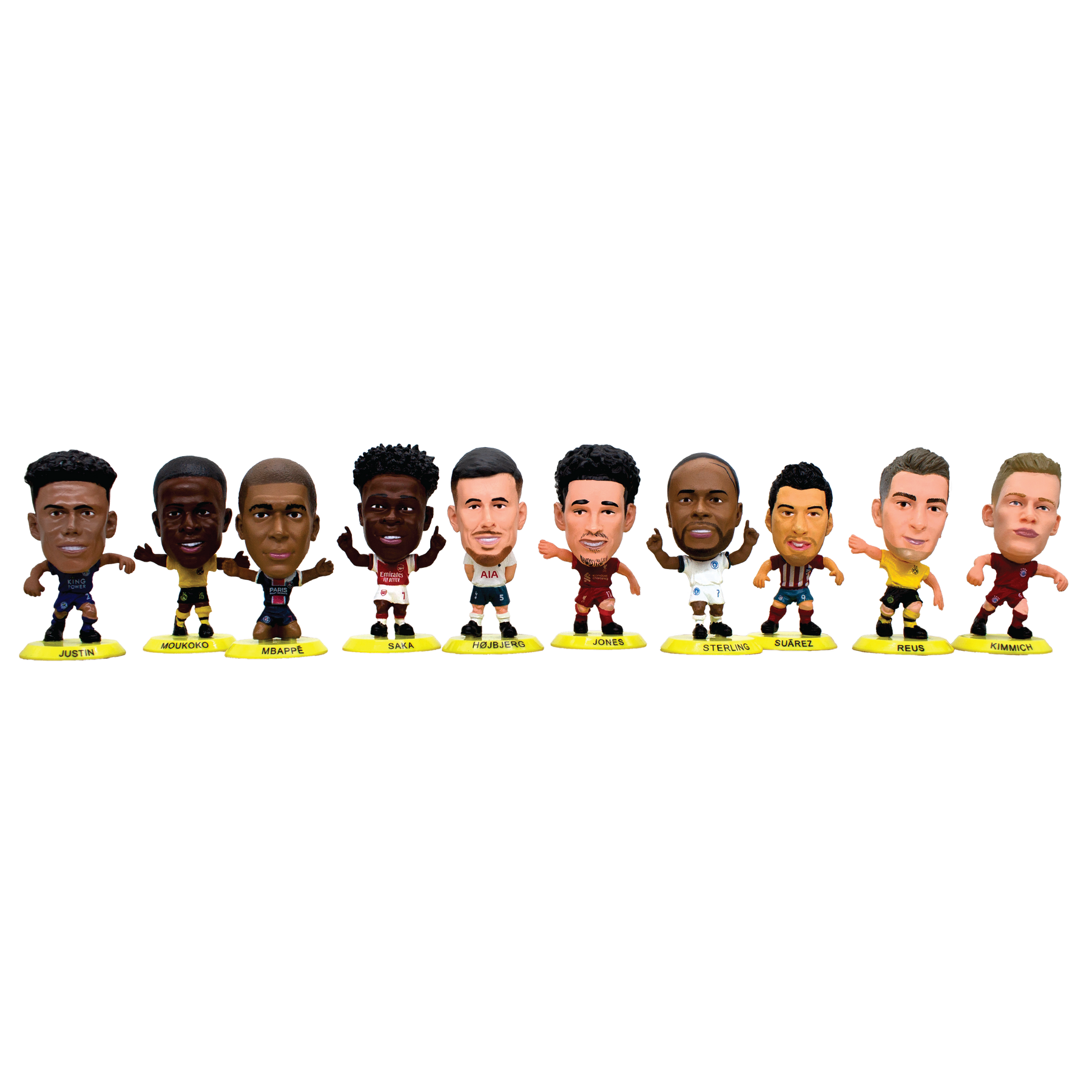 This 10-figure bundle includes Bukayo Saka, Curtis Jones, James Justin, Joshua Kimmich, Kylian Mbappé, Luis Suarez, Marco Reus, Pierre-Emille Højbjerg, Raheem Sterling (Away Kit), and Youssoufa Moukoko, all mounted on yellow bases, exclusive to the 2022 SoccerStarz Blind Bag range.